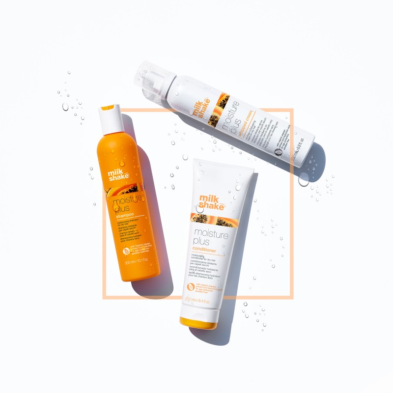 Erlebe mit dem milk_shake Moisture Plus Conditioner intensive Feuchtigkeitspflege für trockenes Haar. Angereichert mit Bio-Papaya-Extrakt, Integrity 41® und Hyaluronsäure, verleiht er deinem Haar Geschmeidigkeit und schützt die Farbe.